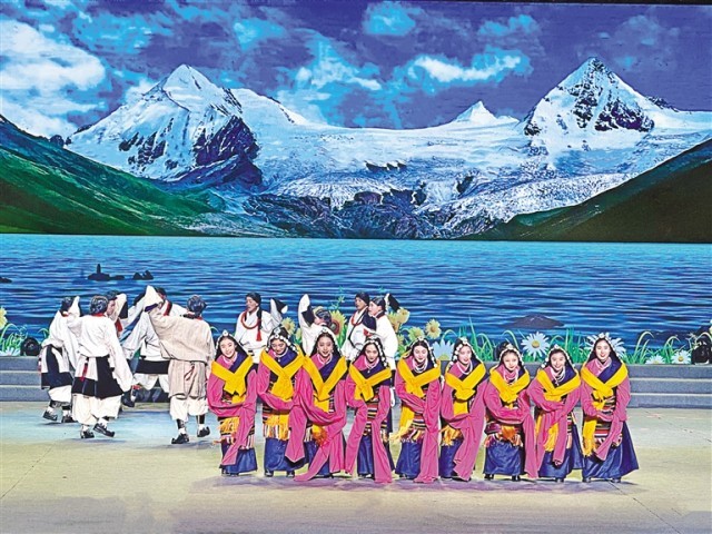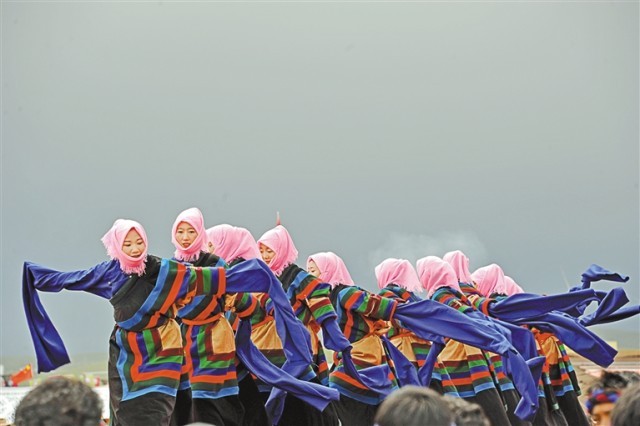 图为班戈县群众在那曲市11县区文艺调演比赛中表演舞蹈。