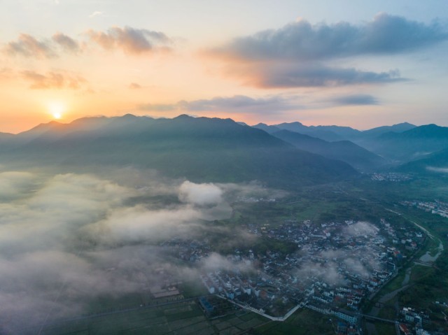 这是晨曦中的诸暨市赵家镇花明泉村(无人机照片,8月15日摄)。