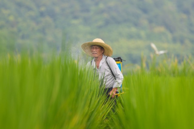 8月14日,诸暨市赵家镇花明泉村村民何新云在稻田内喷洒农药。