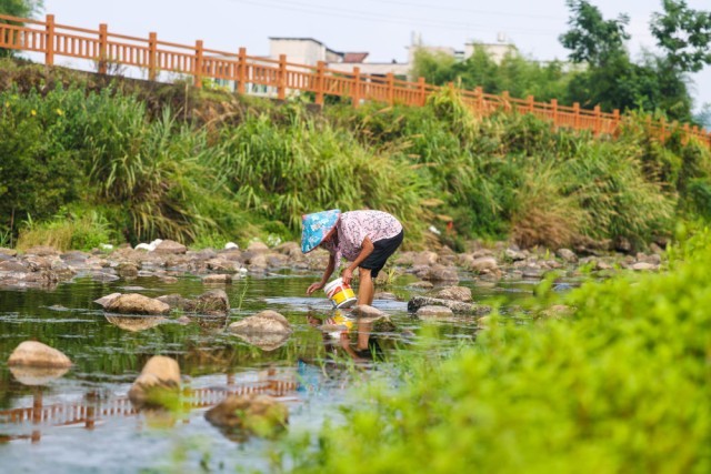 8月14日,诸暨市赵家镇花明泉村村民在黄檀溪中摸螺蛳。