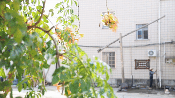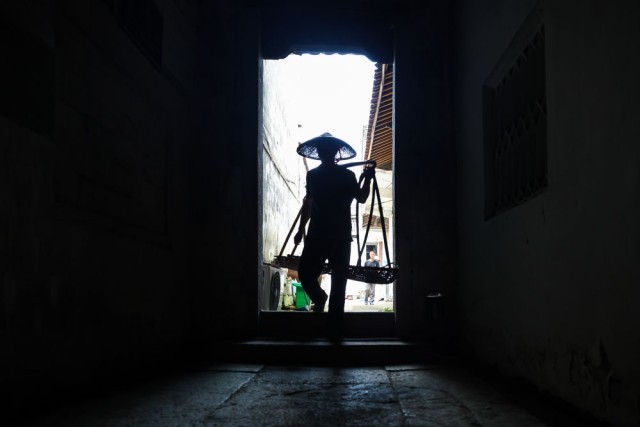 8月14日,诸暨市赵家镇花明泉村村民在何燮侯故居内挑担行走。
