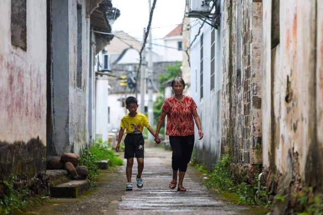 8月14日,诸暨市赵家镇花明泉村村民何金方(右)牵着孙子何豪杰走在村内的石板步道上。这处石板步道全长约1公里,清代建成后一直使用至今。