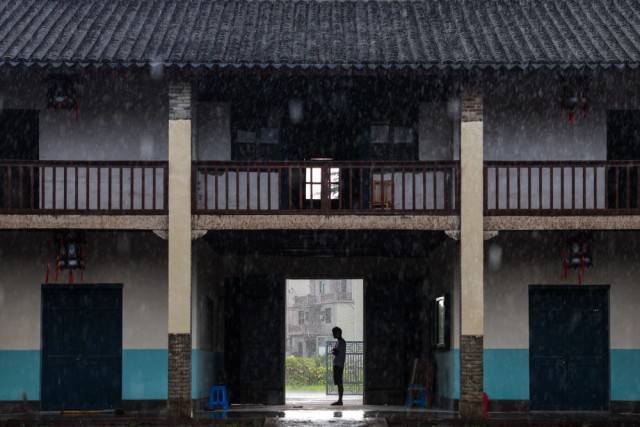 8月13日,诸暨市赵家镇花明泉村村民在懌善堂内避雨。