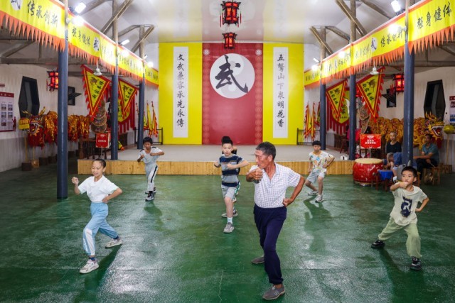 8月14日夜,诸暨市赵家镇花明泉村的少年们在师傅何新云(右三)的带领下练习赵家拳棒。