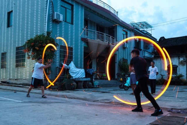 8月14日夜,诸暨市赵家镇花明泉村村民在村中空地练习赵家拳棒中的“火流星”技巧。
