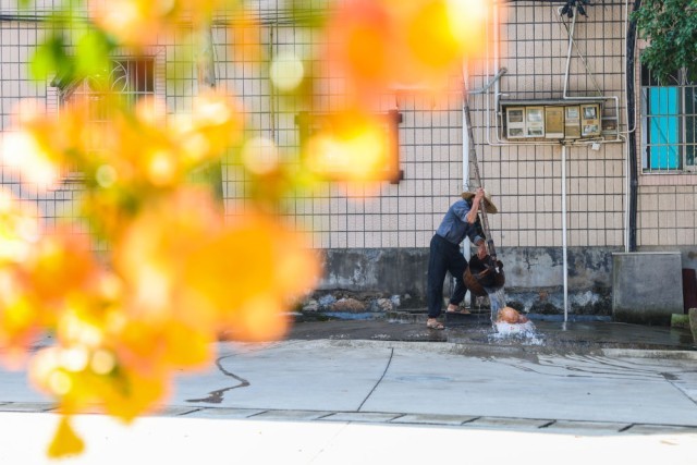 8月15日,诸暨市赵家镇花明泉村村民使用古井井水洗菜。