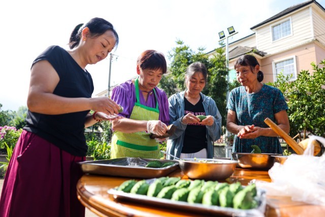 8月15日,诸暨市赵家镇花明泉村村民们在一起制作当地特色食物青饺。