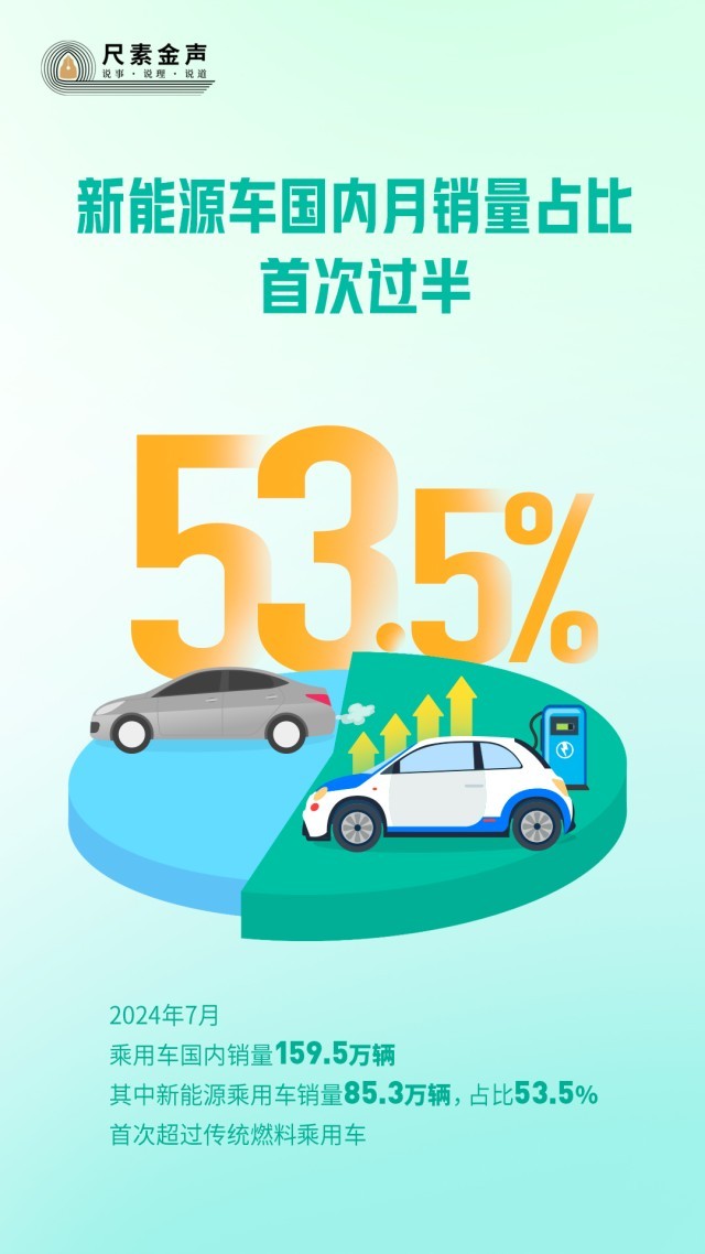 中国汽车工业协会最新统计显示,7月,乘用车国内销量159.5万辆,其中新能源乘用车销量85.3万辆,占比53.5%,首次超过传统燃料乘用车。
