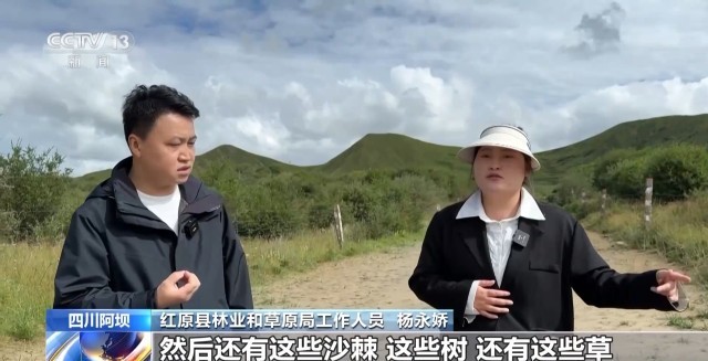 红原县林业和草原局工作人员 杨永娇:旁边的这个高山柳,还有这些沙棘、这些树,这些草,都是我们在治理过程中种下去的。像之前,它们就是流动沙地,沙可以直接一捏就出来。植被覆盖度,由之前的不足10%,到现在的60%及以上。