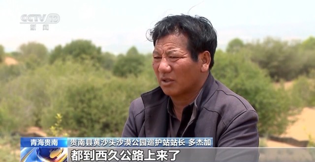 贵南县黄沙头沙漠公园巡护站站长 多杰加:以前,沙子最严重的时候,都到西久公路上来了,有时候路会被沙子掩埋,三四天都通不了。我们的草场都被沙子埋了,拉加村的97户、完秀村的230户全都搬走了。最开始的时候,围树苗用的沙障都是石头,需要用牦牛驮过来,有些地方还需要人背过去,条件特别艰苦。