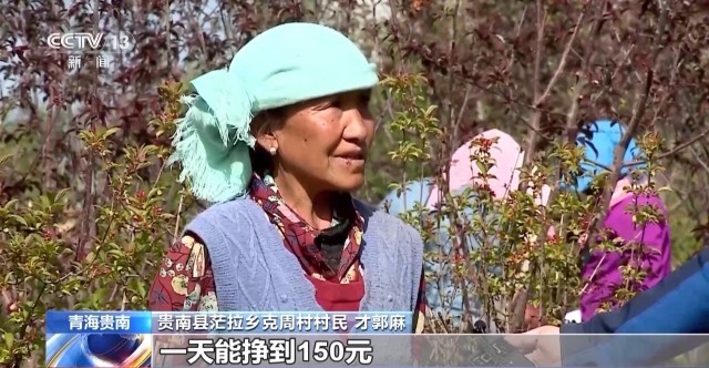 贵南县茫拉乡克周村村民 才郭麻:我是克周村的,每年种树,一天能挣到150元。今年,在过马营种了一个多月的树,到这边也将近20天了,在家门口就能挣到这么多钱,对我的生活也非常有帮助。