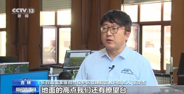 长白山国家级自然保护区管理局宣教科负责人 张荣杰:在空中我们有卫星遥感的服务,无人机日常对保护区进行巡查,地面的高点我们还有瞭望台,上面建设有“森林眼”等一些设备,道路和森林的边界,还有700兆赫相机和道路监控。