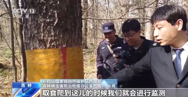 长白山国家级自然保护区管理局森林病虫害防治检疫办公室检疫员 张辉:幼虫会上树取食,取食爬到这儿的时候我们就会进行监测,一天能有多少幼虫。