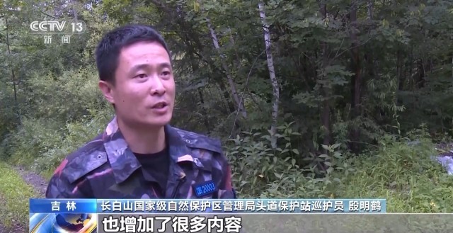 长白山国家级自然保护区管理局头道保护站巡护员 殷明鹤:针对我们的巡护工作,也增加了很多内容,比如说病虫害、疫源疫病,不像以前趋向于保护和防火,现在我们覆盖面更广,更关心我们保护区森林的健康状况和野生动物的健康状况。