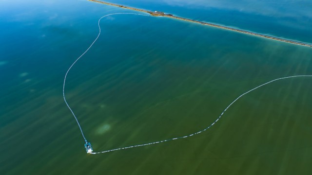 在察尔汗盐湖拍摄的一艘采盐船(无人机照片)。新华社发 潘彬彬 摄