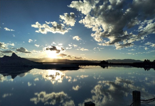 微风拂过湖面扬起阵阵涟漪,在阳光的炙烤下,脚下的盐粒白得刺眼,斑斓的湖水透亮艳丽,像是散落在大地上的宝石,这里就是被称为“大地调色盘”的翡翠湖。