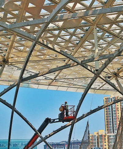 昼夜不舍,加紧施工。目前,工程土方施工已接近完成,主体结构完成92%,设备安装完成40%。“正在进行精装修,以及市政配套管廊和‘京帆’屋盖余下工程的施工。”周伟说,“争取年底前主体基本完工。”