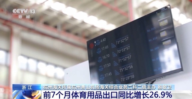 杭州海关所属义乌海关统计分析科 徐晓冰:随着欧洲杯、奥运会等国际赛事的举办,今年义乌体育用品出口迎来“大年”。1至7月,义乌体育用品及设备出口58.1亿元,同比增长37.8%。