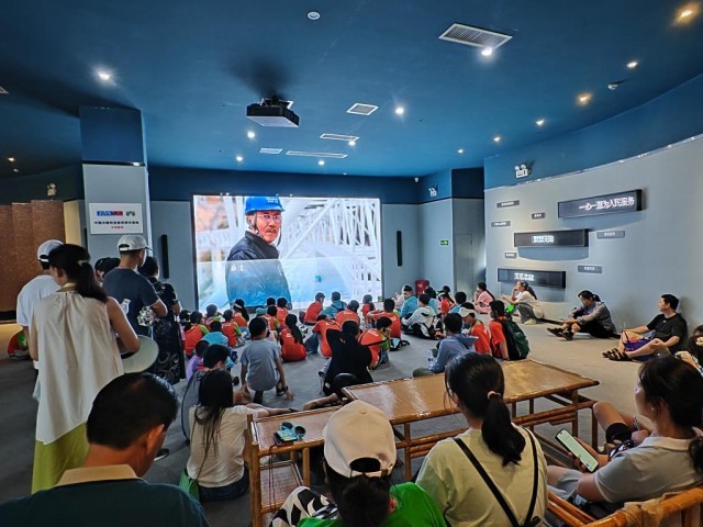 8月14日,来自河南郑州研学团队的中小学生在南仁东事迹馆观看影片。新华社记者 齐健 摄