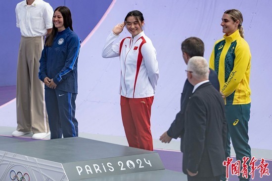 当地时间7月31日,法国巴黎协和广场,奥运会自由式小轮车女子公园赛颁奖典礼上,19岁的中国选手邓雅文夺得冠军,在站上领奖台前向记者展示她佩戴的白色发簪。中青报·中青网记者 李隽辉/摄