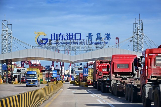 2024年8月6日,货车有序出入山东港口青岛港前湾集装箱码头。新华社记者 李紫恒 摄