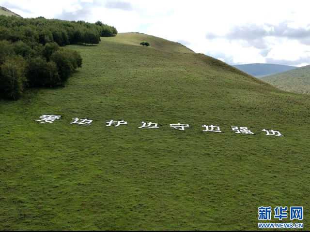 王玉发用1000余块石头在大山上堆砌出“爱边 护边 守边 强边”八个大字。新华网发(左泰 摄)