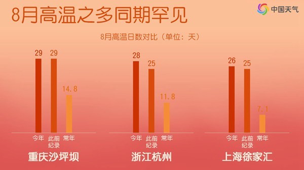 不仅高温强度强,持续时间也长。多地高温日数都超过了20天,尤其南方高温日数大幅偏多10天以上。像重庆沙坪坝和新疆吐鲁番,8月高温日数高达29天,几乎“全勤”;浙江杭州8月高温多达28天,为高温最多的8月;上海徐家汇26天,为当地观测史里高温最多的一个月。