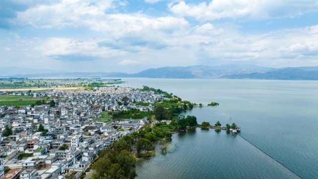 云南省大理市古生村与洱海风光(无人机照片,5月6日摄)。新华社记者 胡超 摄