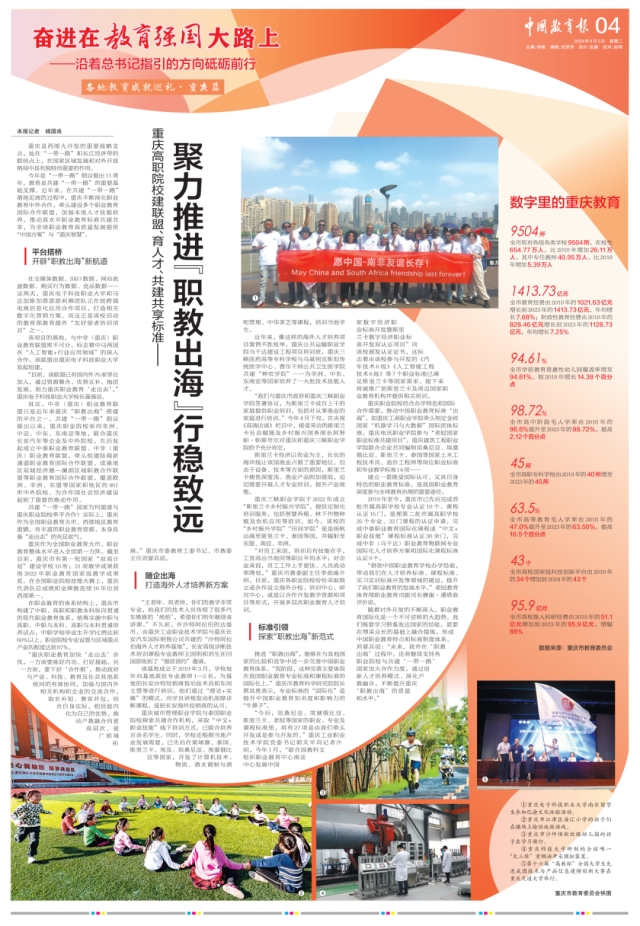 随着对外开放的不断深入,职业教育国际化是一个不可逆转的大趋势。我们既要学习借鉴发达国家的经验,更要在博采众长的基础上融合提炼,形成中国职业教育特点和标准制度体系。刘宴兵说:“未来,我市在‘职教出海’过程中,还将继续支持各职业院校与共建‘一带一路’国家加大合作力度,通过创新人才培养模式、深化产教融合,不断提升重庆‘职教出海’的质量和水平。”