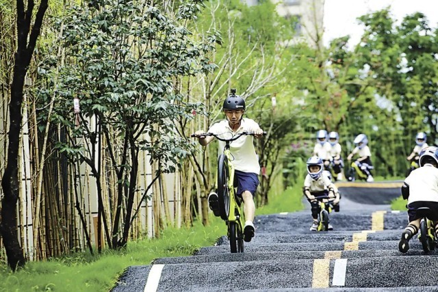 重庆市沙坪坝新丝路幼儿园的孩子在学习骑行。