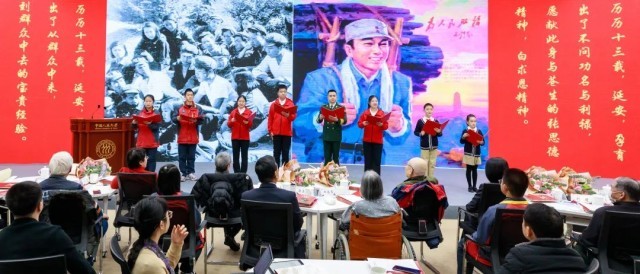 ▲活动现场,张思德生前所在部队官兵与由中国人民大学、延安中学、人大附小学生组成的“延河讲师团”,共同带来原创朗诵《我们从延安走来》。