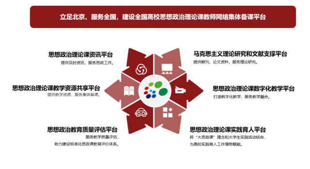 2019年的学校思想政治理论课教师座谈会上,习近平总书记在谈到各地各高校尤其是北京市的有益探索时,专门提到了“北京高校思想政治理论课高精尖创新中心”。自2015年中心成立,中国人民大学全面建设面向大中小学思政课教师的一体化网络资源平台,打造服务全国大中小学思政课教师的“中央厨房”。