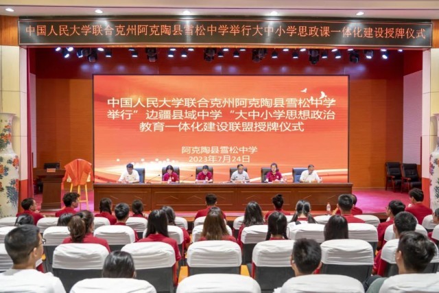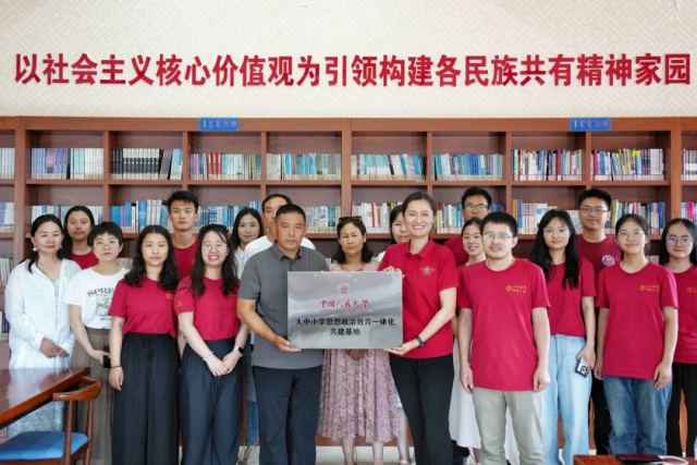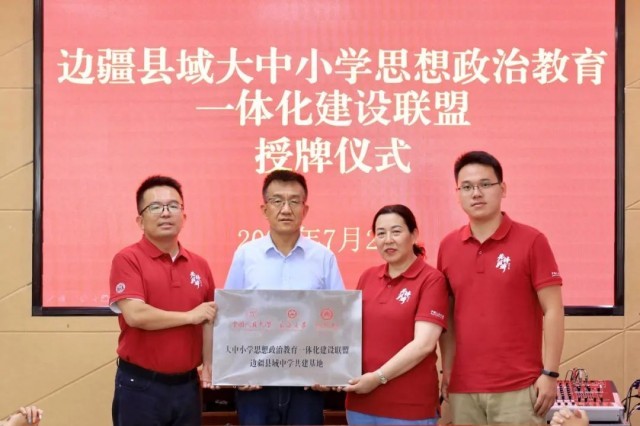 ▲中国人民大学向边疆“大中小学思想政治教育一体化共建基地”授牌。
