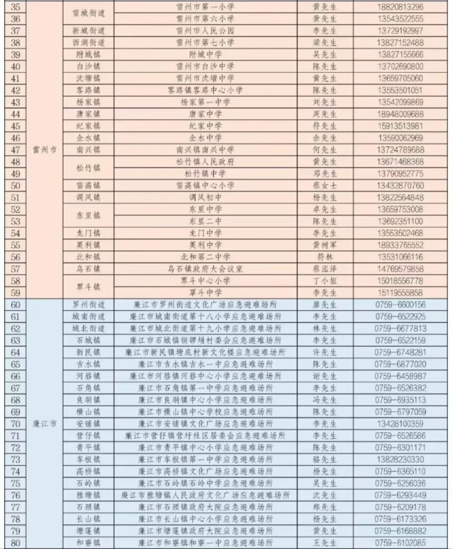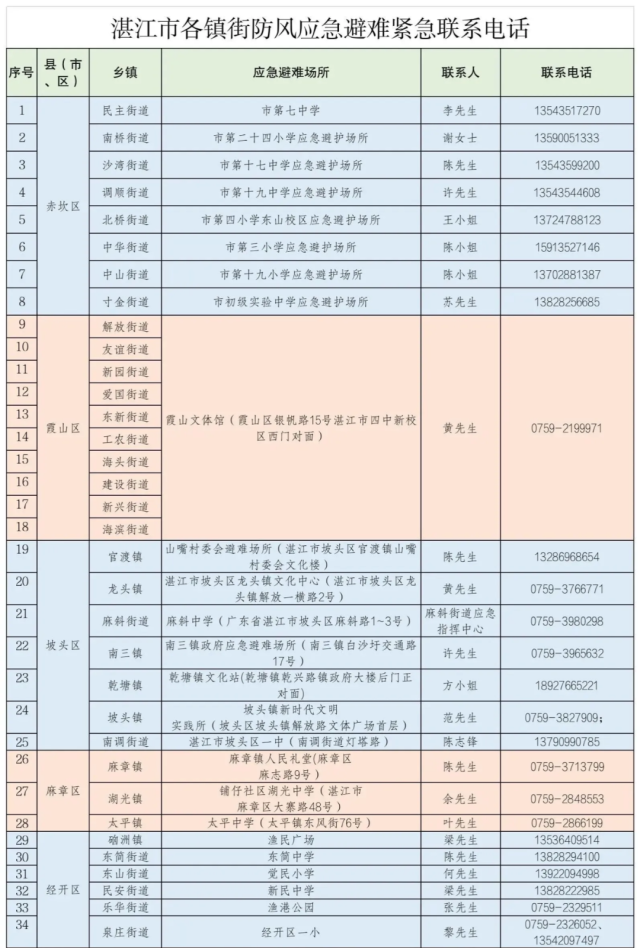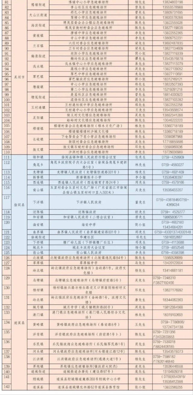 湛江市各镇街防风应急避难紧急联系电话(滑动查看详情↓)