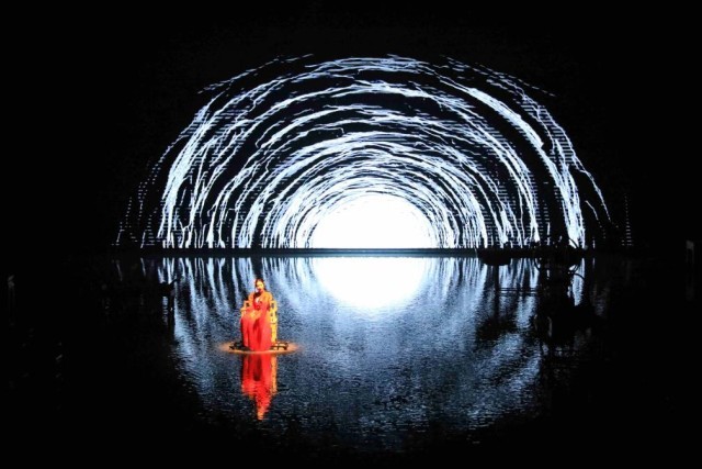 36扇高大的雕花木门轻启,演员曼妙起舞;舞台上光影变幻,不时落下层层水帘……“太震撼了!”观众们不约而同发出感叹。