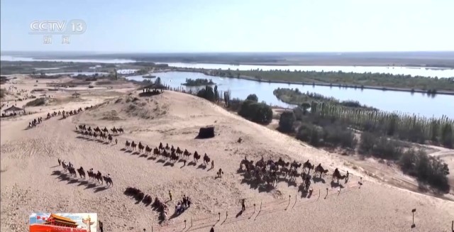 总台记者 朱达:宁夏银川市黄沙古渡景区以一处千年古渡命名,汇集了黄河、沙漠、湖泊、湿地和田园等多种自然风光。十一期间全国各地的游客来到黄沙古渡, 一方面可以欣赏大漠风光、感受黄河文化 ,另一方面可以体验骑骆驼、沙漠冲浪和飞索等多种项目。
