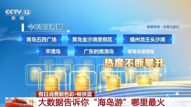 出行平台的数据统计,今年国庆假期,青岛五四广场、黄岛金沙滩度假区,福州龙王头沙滩,平潭岛,广东的南澳岛等海岛度假区热度不断攀升。