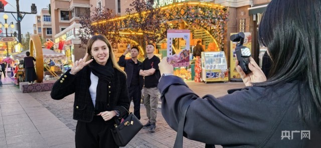 除了库尔德宁的自然景观,伊宁市六星街、喀赞其文化旅游区也深得旅游博主吴思瑶的青睐。夜晚的六星街,当欢快的音乐响起,各族群众不约而同地跳了起来,看到这一幕,吴思瑶迫不及待地冲向前:“啊,我要拍……”