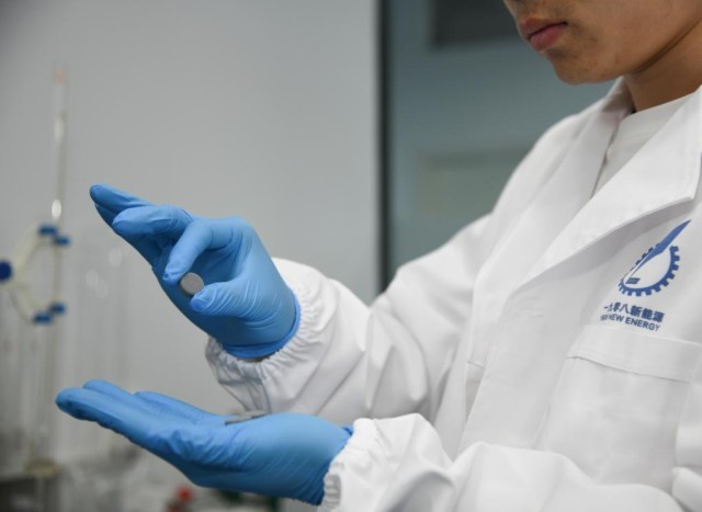 西安一九零八新能源科技有限公司科研人员在展示由其研发的复杂金属基复合固态储氢材料。新华社记者 张博文 摄