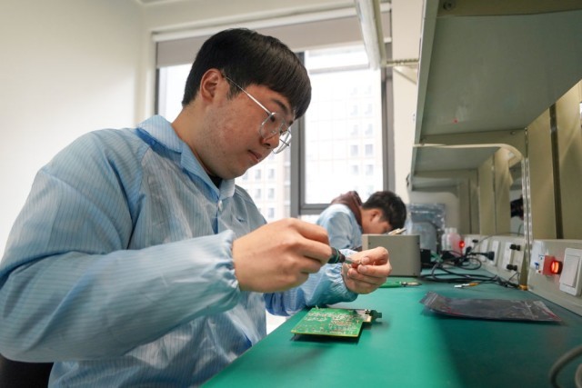 在四川省成都市成达鸿业科技有限公司,研发人员在组装、测试产品(2月23日摄)。