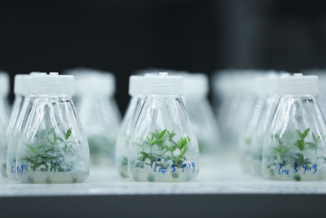 这是10月28日在位于甘肃省陇南市武都区的陇南市经济林研究院实验室内拍摄的油橄榄组培苗。