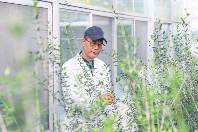 10月28日,在位于甘肃省陇南市武都区的陇南市经济林研究院油橄榄研究所大堡油橄榄试验园,陇南市经济林研究院油橄榄研究所高级工程师王贵德在智能温室内观察杂交种苗生长情况。