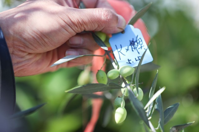 10月28日,在位于甘肃省陇南市武都区的陇南市经济林研究院油橄榄研究所大堡油橄榄试验园,陇南市经济林研究院油橄榄研究所高级工程师王贵德观察一株由奇迹油橄榄(原产地希腊)和佛奥油橄榄(原产地意大利)杂交的种子的生长情况。