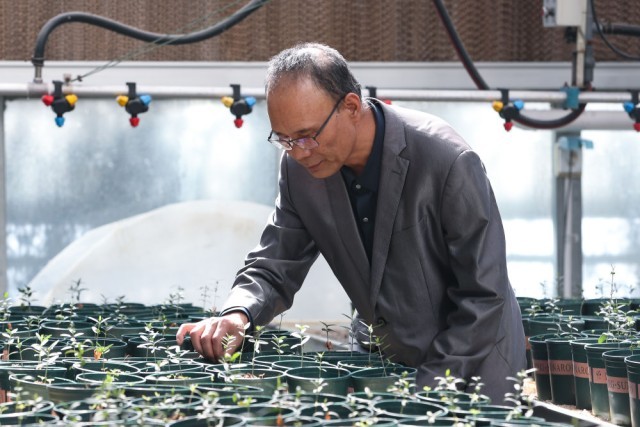 10月28日,在位于甘肃省陇南市武都区的陇南市经济林研究院的智能温室内,陇南市经济林研究院油橄榄研究所高级工程师王贵德观察重离子辐照育种的油橄榄苗生长情况。