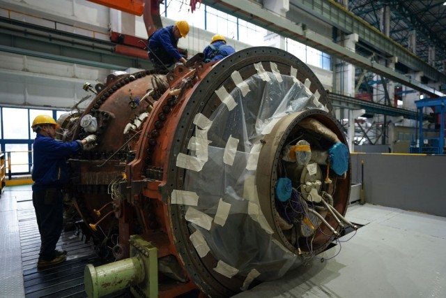 这是在位于四川省德阳市的东方汽轮机有限公司生产车间内拍摄的我国首台自主研制的F级50兆瓦重型燃气轮机原型机(代号G50)(10月21日摄)。