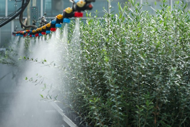 10月28日,在位于甘肃省陇南市武都区的陇南市经济林研究院的智能温室内,设备自动为油橄榄苗浇水。