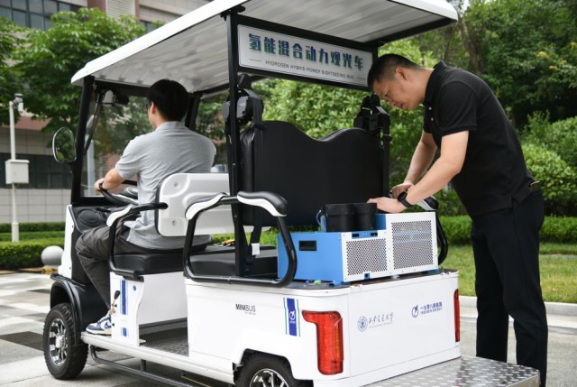 7月10日,西安一九零八新能源科技有限公司工作人员调试一款氢能混合动力观光车。
