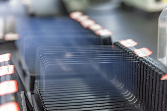 3月4日,技术人员在位于西安高新区的陕西光电子先导院科技有限公司展示一片晶圆。