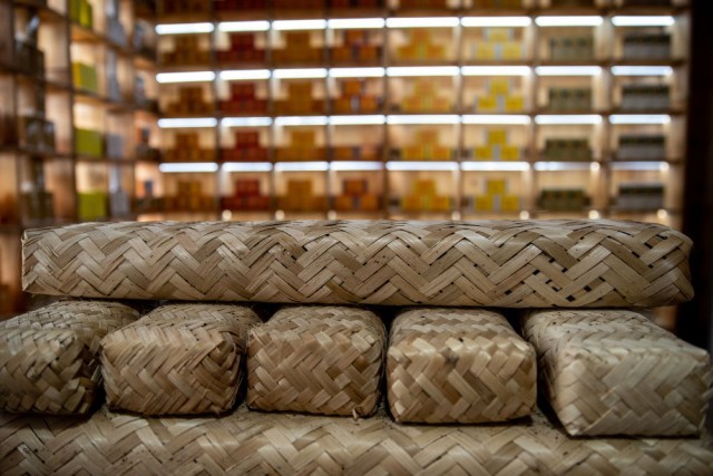 10月27日在四川省雅安市的雅安茶厂有限公司拍摄的装有藏茶茶饼的竹条包装,这种包装方式至今保留。新华社记者 储加音 摄