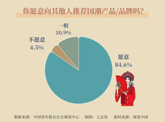 如今,国潮不仅是年轻人展现文化自信、弘扬传统文化的重要方式,更是走入寻常百姓家,成为日常生活的一部分。调查显示,80.7%的受访青年认为国潮是当代青年的一种潮流风向标,84.6%的受访青年愿意向其他人推荐国潮产品/品牌。进一步分析发现,85后受访者愿意推荐的比例更高,为89.0%,之后是90后(88.4%)。